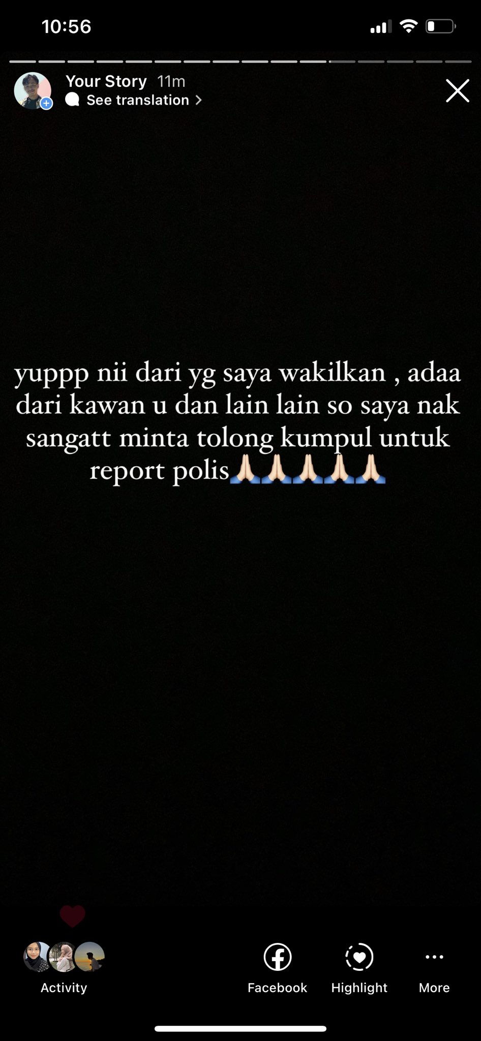 Beliau mahu settle luar dan ingin membayar kos pembaikan. Walaupun sakit segera buat report polis. Apa yang boleh saya adu kepada Polis Diraja Malaysia.